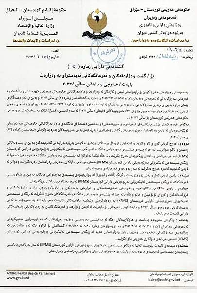 اصدرت وزارة المالية والاقتصاد في حكومة اقليم كوردستان، اليوم الثلاثاء، تعميما بشأن بالصرفيات والايرادات المالية للعام الحالي 2023 يتم العمل به لحين اقرار قانون الموازنة العامة لهذا العام.