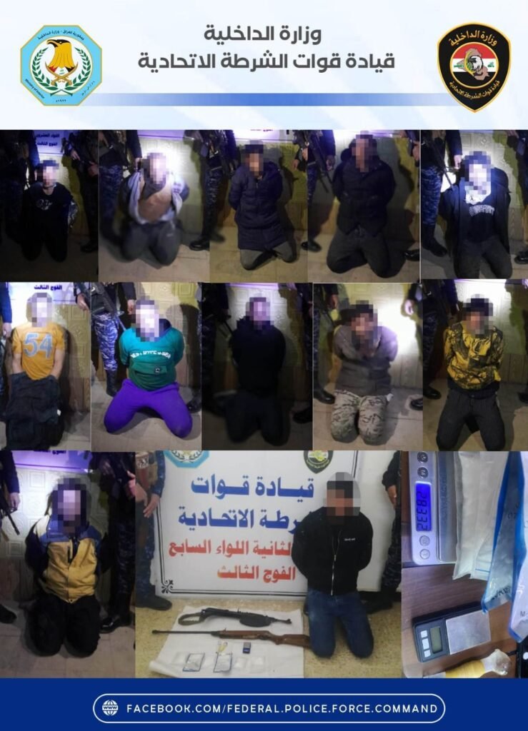 أسفرت الجهود الأمنية المتواصلة لقطعات الشرطة الاتحادية في متابعة تجار ومروجي ومتعاطي المخدرات عن تمكن مفارز اللواء العشرين الفرقة الخامسة واللواء السابع الفرقة الثانية ضمن مناطق (سبع قصور ، الطوبجي ) بإسناد الجهد الاستخباري ومفرزة من مديرية مكافحة المخدرات والمؤثرات العقلية ، من إلقاء القبض على 12 متهماً بتجارة وترويج وتعاطي المخدرات ، حيث ضُبِطَت بحوزتهم كمية من مادة الكريستال ، بندقيتين مختلفة الأنواع ، أدوات للتعاطي ، ميزان الكتروني ، وحبوب مخدرة.
